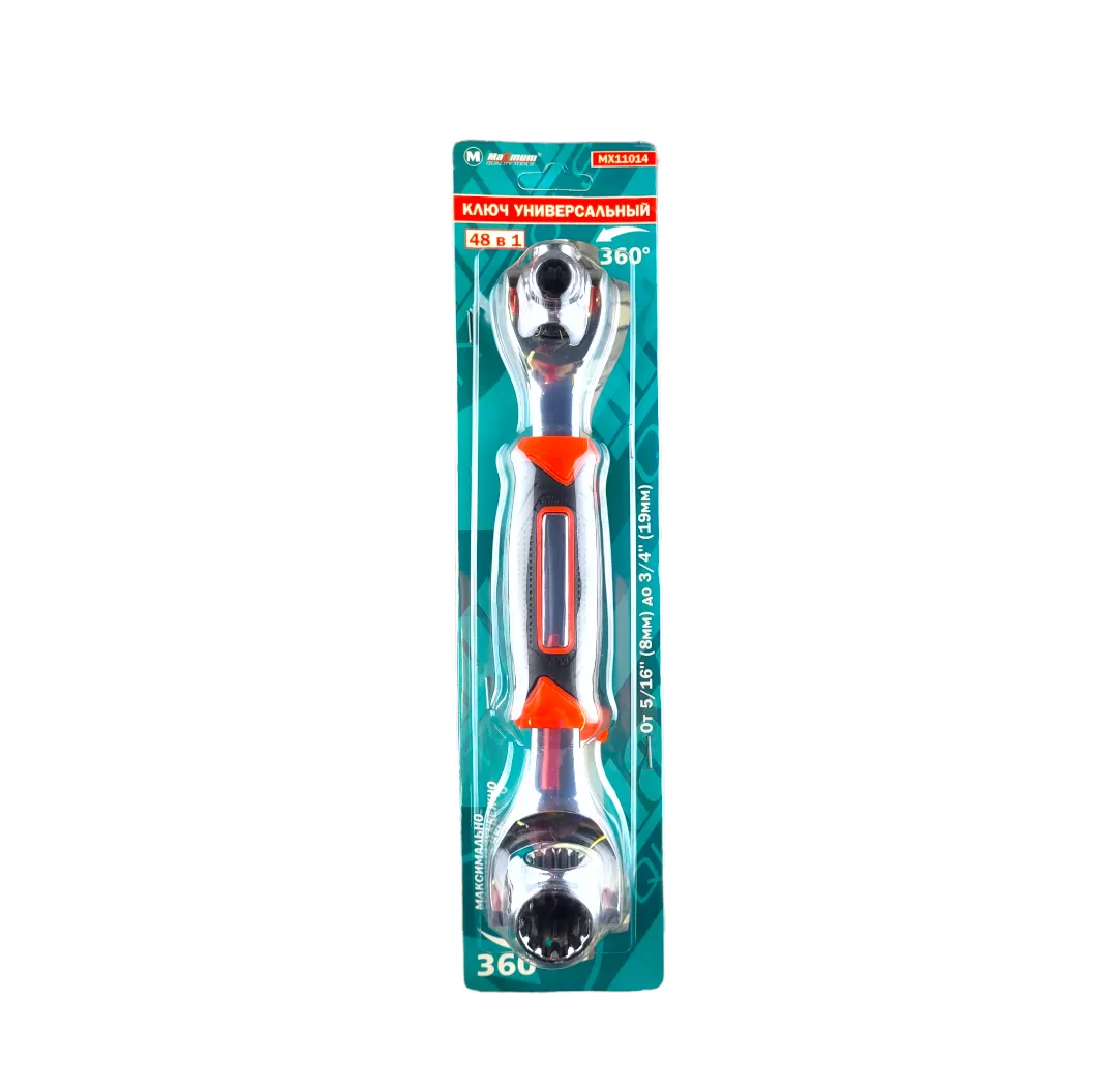 Универсальный ключ 48 в 1 – это набор головок диметром от 8 до 19 мм в одном ключе. Ключ может работать с шестью различными профилями гаек с восемью разными размерами. Особая конструкция головок, которые вращаются на 360°, позволяет откручивать и закручивать гайки и болты разной формы: квадратные, 6-гранные, 12-гранные, Torx.