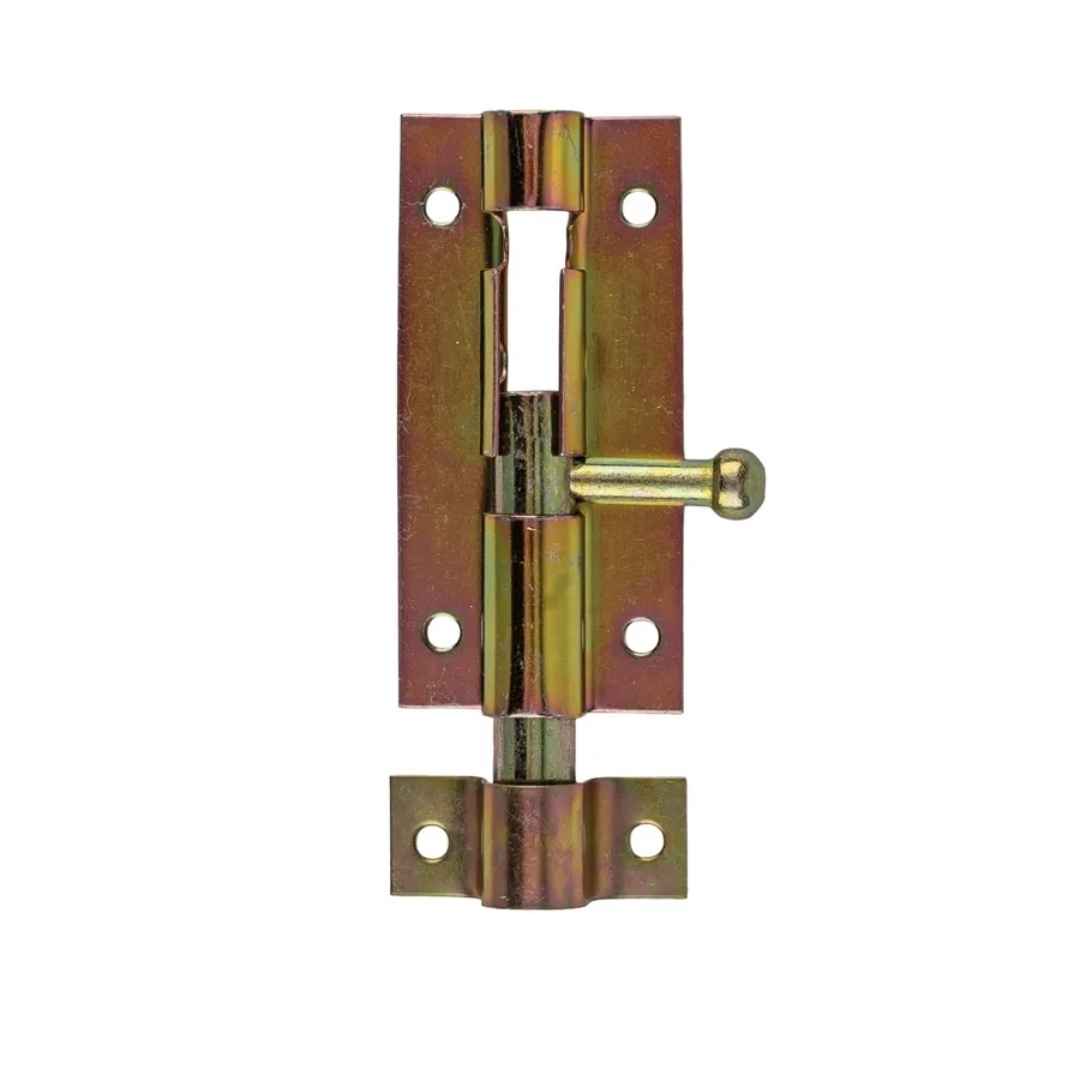 Накладной дверной шпингалет 100 мм считается самой простой и в то же время надёжной конструкцией. Задвижка-шпингалет выполнен из стали покрытый желтым цинком 38x100 мм предназначен для фиксации створок дверей в закрытом положении. Круглая ручка, зафиксированная в закрытом положении надежно препятствует случайному открытию: ход ригеля 50 мм. Число отверстий для шурупов 6.